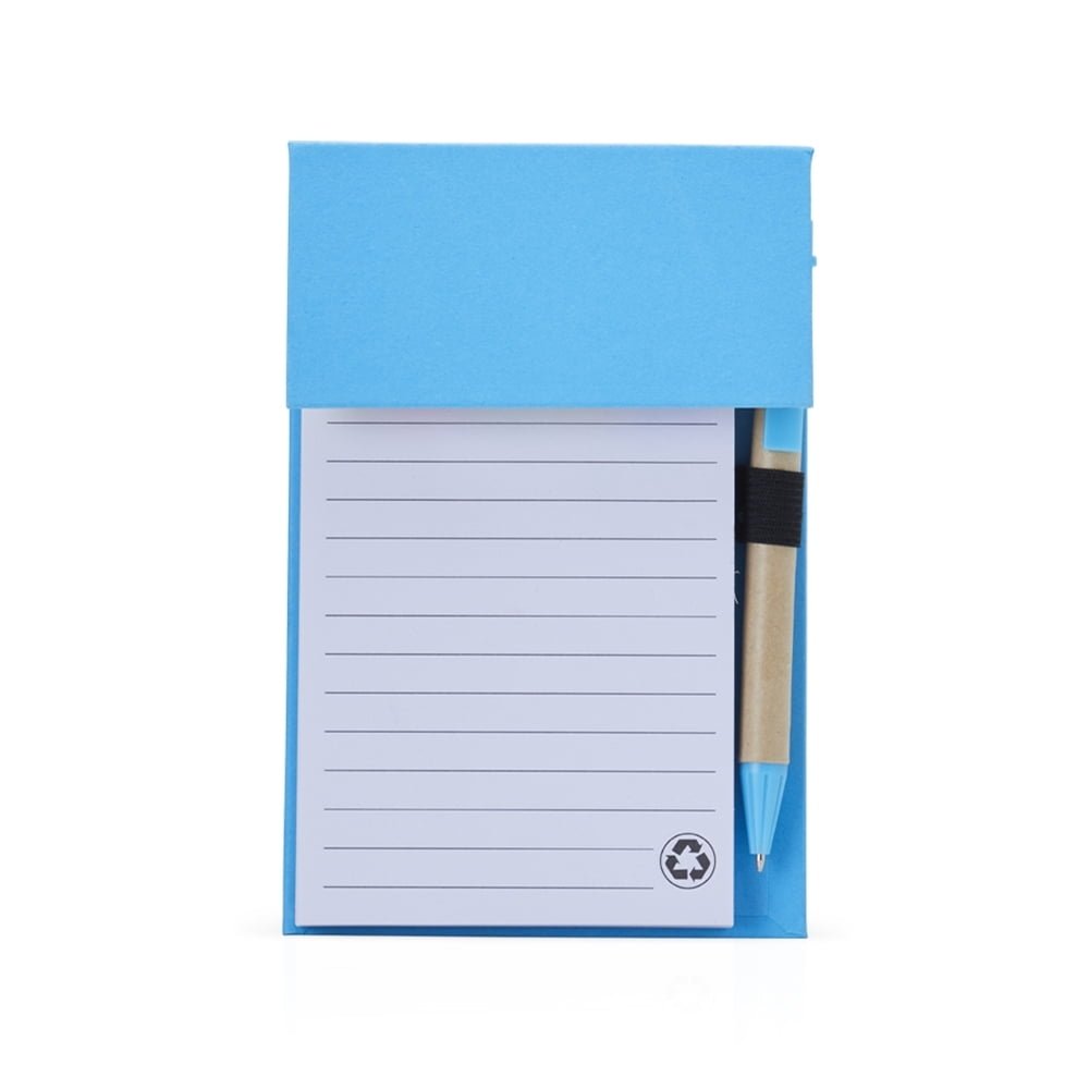 Bloco de Anotações Atacado Personalizado, feito em kraft com 6 blocos autoadesivos coloridos com aproximadamente 20 folhas e bloco com aproximadamente 100 folhas brancas com pauta. Possui porta caneta elástico e acompanha caneta de papelão e detalhes plásticos, carga esferográfica azul 1.0mm e acionamento por clique.