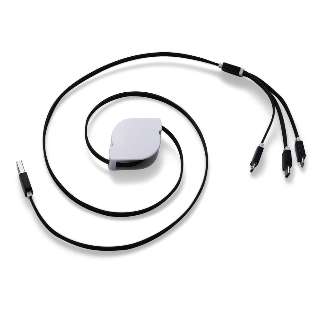 Cabo USB Retrátil : Cabo USB retrátil com as entradas Lightning/iPhone, V8/Android e Tipo-C/Android. Suporte com rolamento e trava automática.