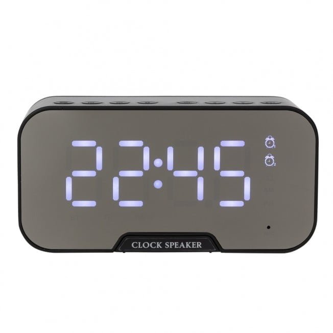 Caixa de Som Brindes: Caixa de som multimídia com relógio despertador e suporte para celular. Produzida em plástico e com borrachas antiderrapantes na área inferior, a caixa de som tem a área frontal espelhada e display de LED, além de um compartimento com suporte para celular – uma espécie de “gaveta” aonde é exibido (CLOCK SPEAKER), basta puxá-la ter acesso ao compartimento. A caixa de som executa nos modos bluetooth, rádio FM, cartão TF-microSD (até 16GB) e entrada auxiliar P2. Acompanha cabo USB e manual em inglês.