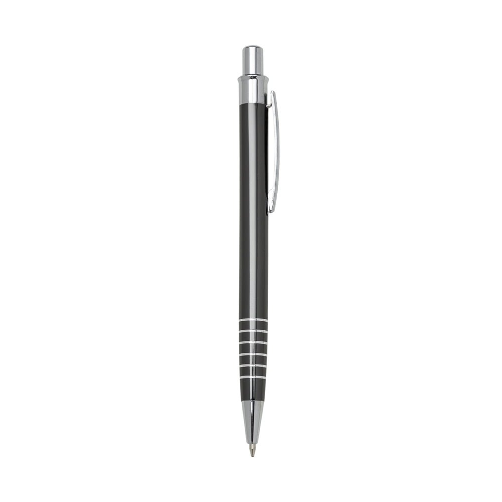 Caneta Personalizada Em Maranhão: Inteira colorida com detalhes prata. Clip metal e possui seis aneis prateados na parte inferior.