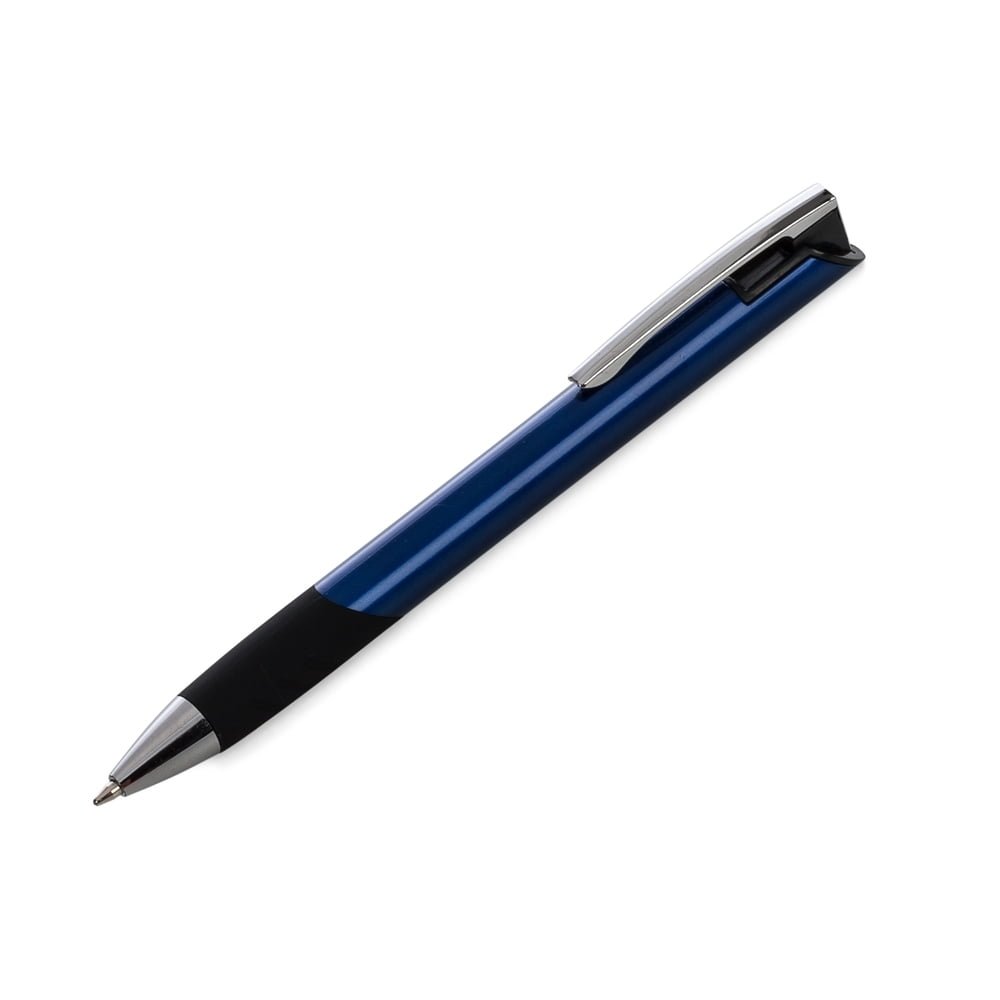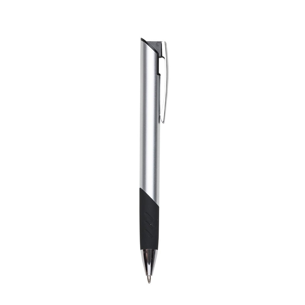 Caneta Plástica Brindes: Com detalhes preto emborrachado. Clip de metal com suporte preto, possui três linhas nas duas laterais da borracha inferior. Aciona por clique.