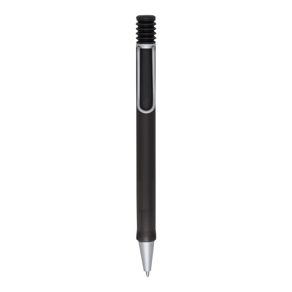 Caneta Plástica Personalizada Minas: Inteira colorida com detalhes prata, acionador com design de mola e clip metal, possui relevo na parte inferior. Aciona por clique.