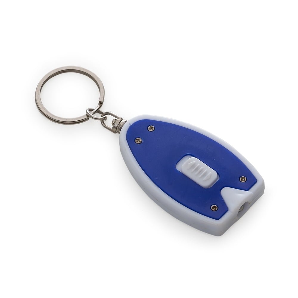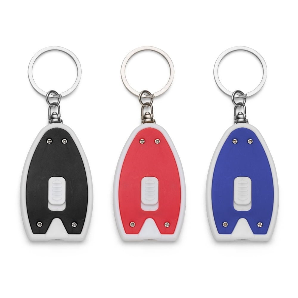 Chaveiro Lanterna Personalizado Atacado: Plástico colorido com detalhe branco. Possui um botão para ligar/desligar lanterna, acompanha 3 baterias AG1.
