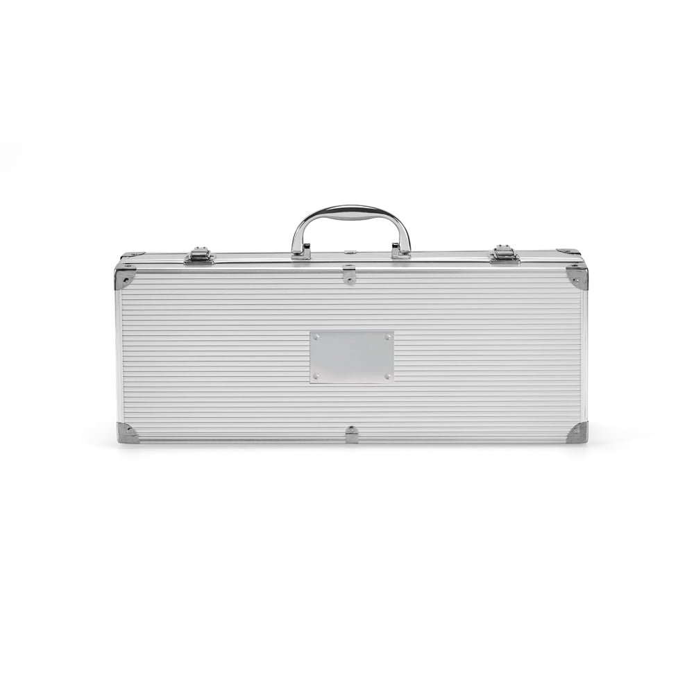 Kit Churrasco Personalizado Guarulhos: Aço inox. Luva de cozinha em poliéster e em estojo de alumínio.