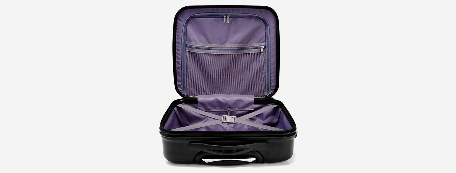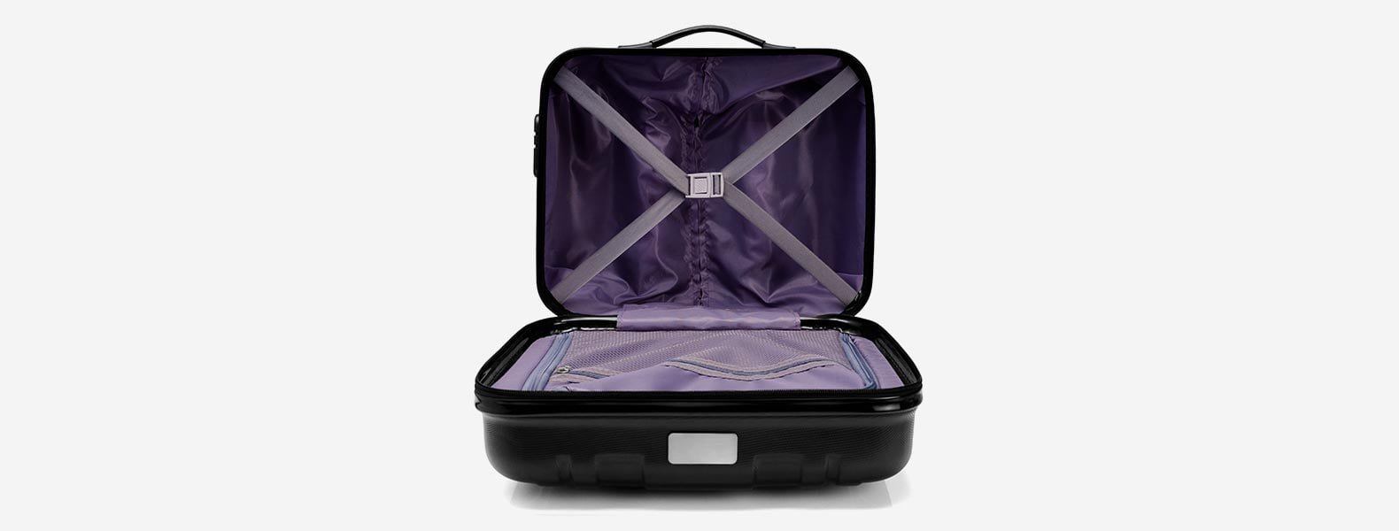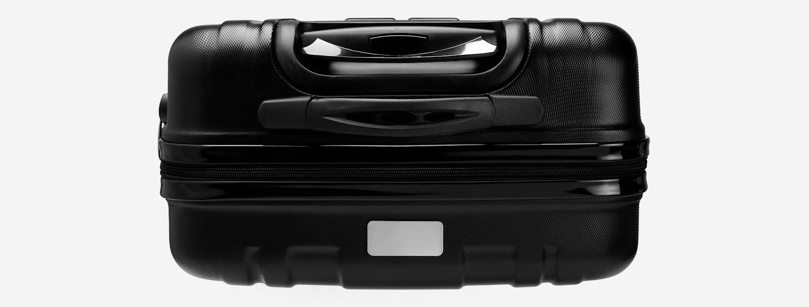 Mala Para Brindes: Mala para Viagem preta em ABS Conta com 4 rodinhas 360º de Ø 5,5cm, 30 litros, emborrachada, alça superior, alça retrátil em alumínio com três estágios e altura máxima aberta de 94cm e duas divisões internas com zíper, elástico para melhor acomodação da bagagem e cadeado com senha estilo TSA.