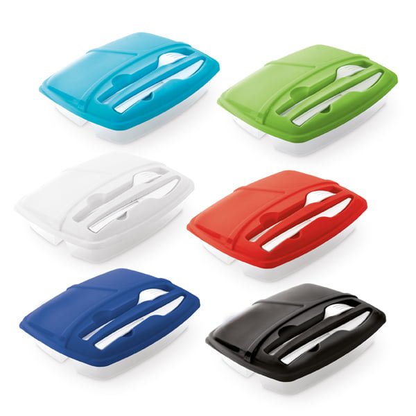 Marmita Plástica Personalizada: PP. Com 3 compartimentos, garfo e faca.
