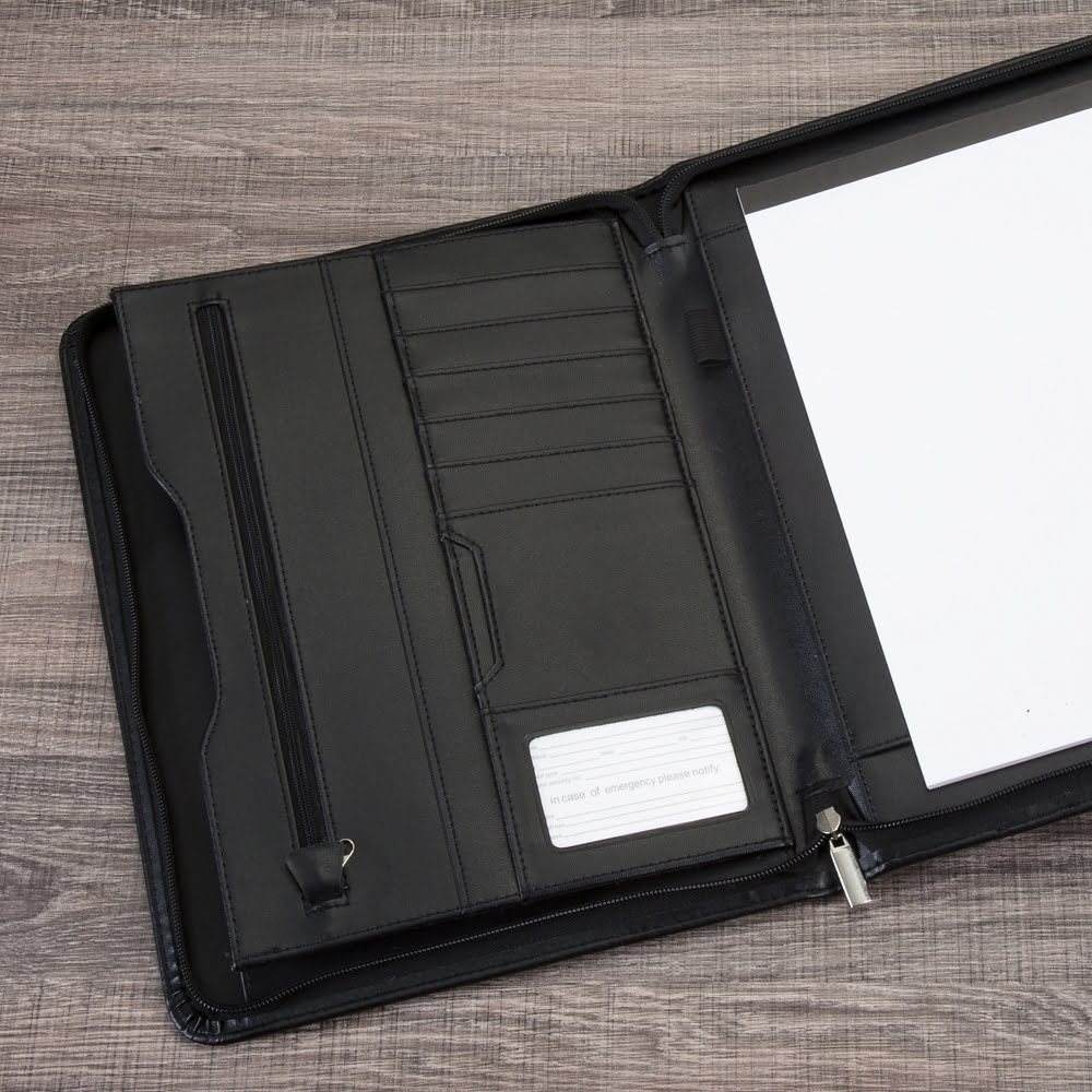 Pasta Convenção Personalizada Atacado : Com zíper, possui 2 compartimentos grandes para arquivar documentos, compartimento interno com zíper, 7 divisórias pequenas para documentos, suporte com visor para cartão de identificação, suporte para caneta(não acompanha caneta) e bloco com 20 folhas pautadas.