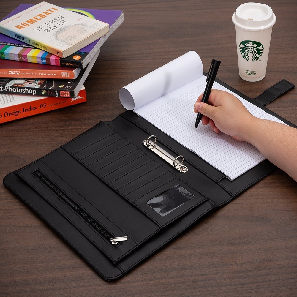 Pasta De Convenção Personalizada: Com fecho imantado e plaquinha personalizável. Produzido em couro sintético, a pasta contém bolso lateral na contracapa e bolso com fechamento em zíper, além divisórias para cartões e/ou documentos com bolso lateral.