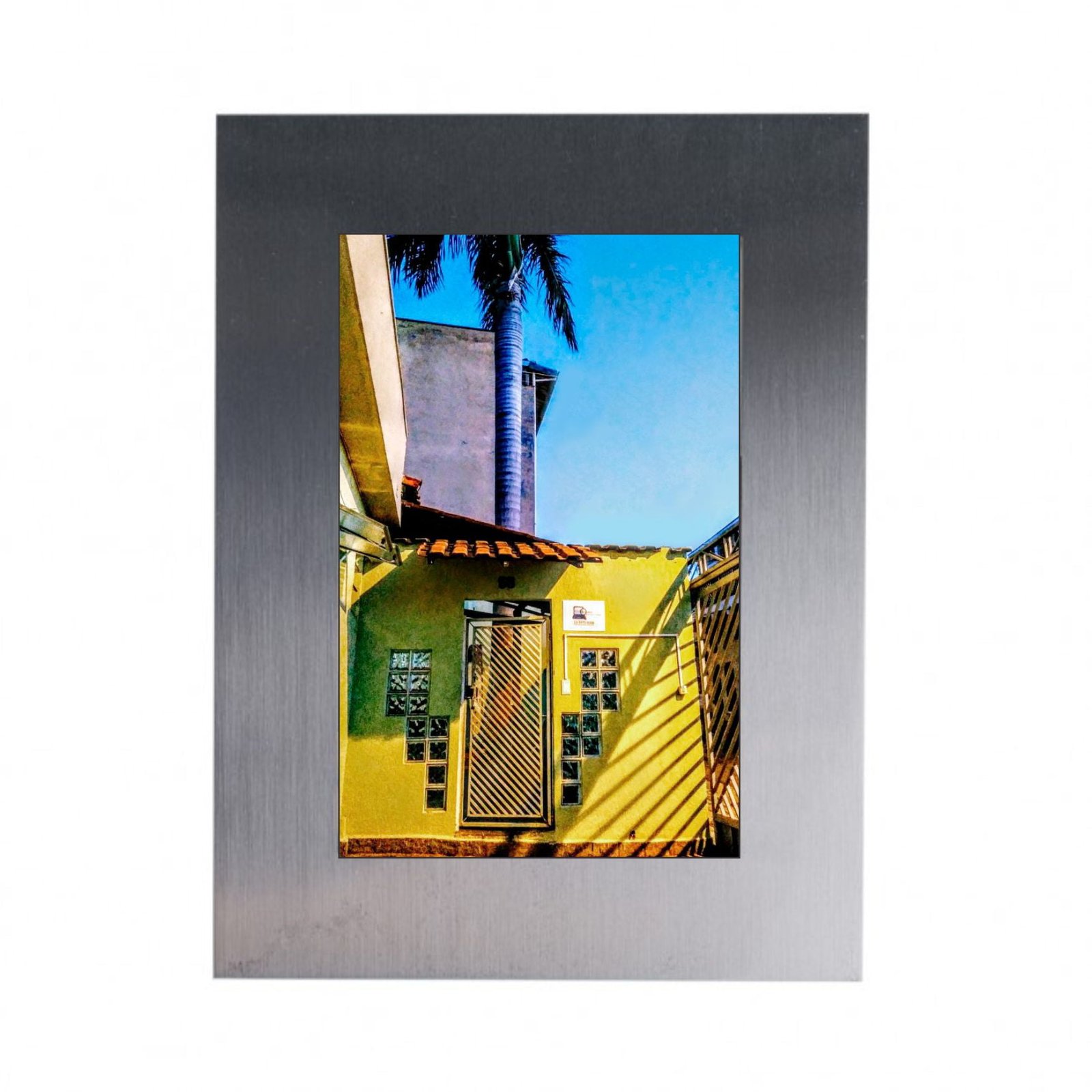 Porta Retrato Promocional: Porta retrato 15 x 10 em inox escovado, modelo chapa metálica acompanha quatro “botões” imã e película protetora anti-risco.